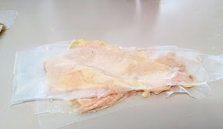 First do your cutting: mince the garlic. Then lay out the chicken on a sheet of wax paper. Then skin should just peel off, you might need a sharp knife to separate the fat but for the most part, just pull!I cut the wax paper around the laid out pieces of skin. Sprinkle some salt and seal that up to freeze.