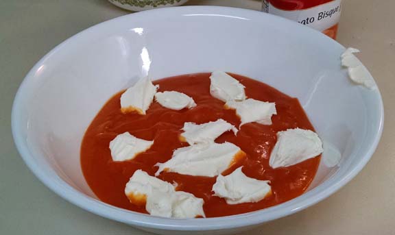 a bowl mix the cream cheese into the tomato bisque soup along with